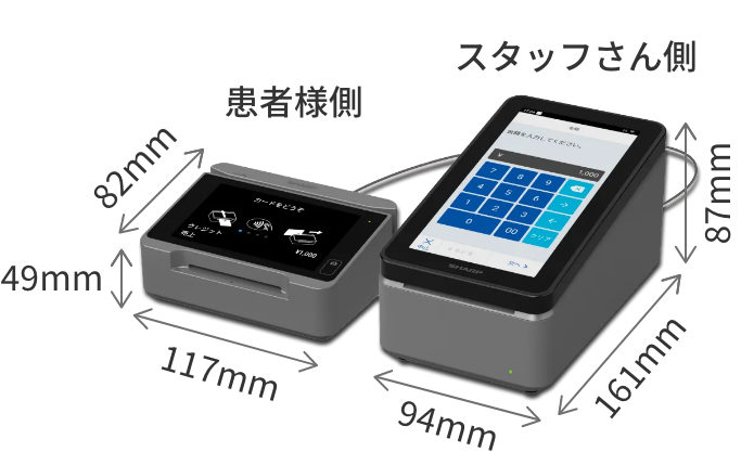 両面の大型タッチパネルが特長のセミセルフレジです。クリニックのスタッフさんと患者様が、対面でコミュニケーションをとりながらお会計操作ができる、双方に優しいシステムです。